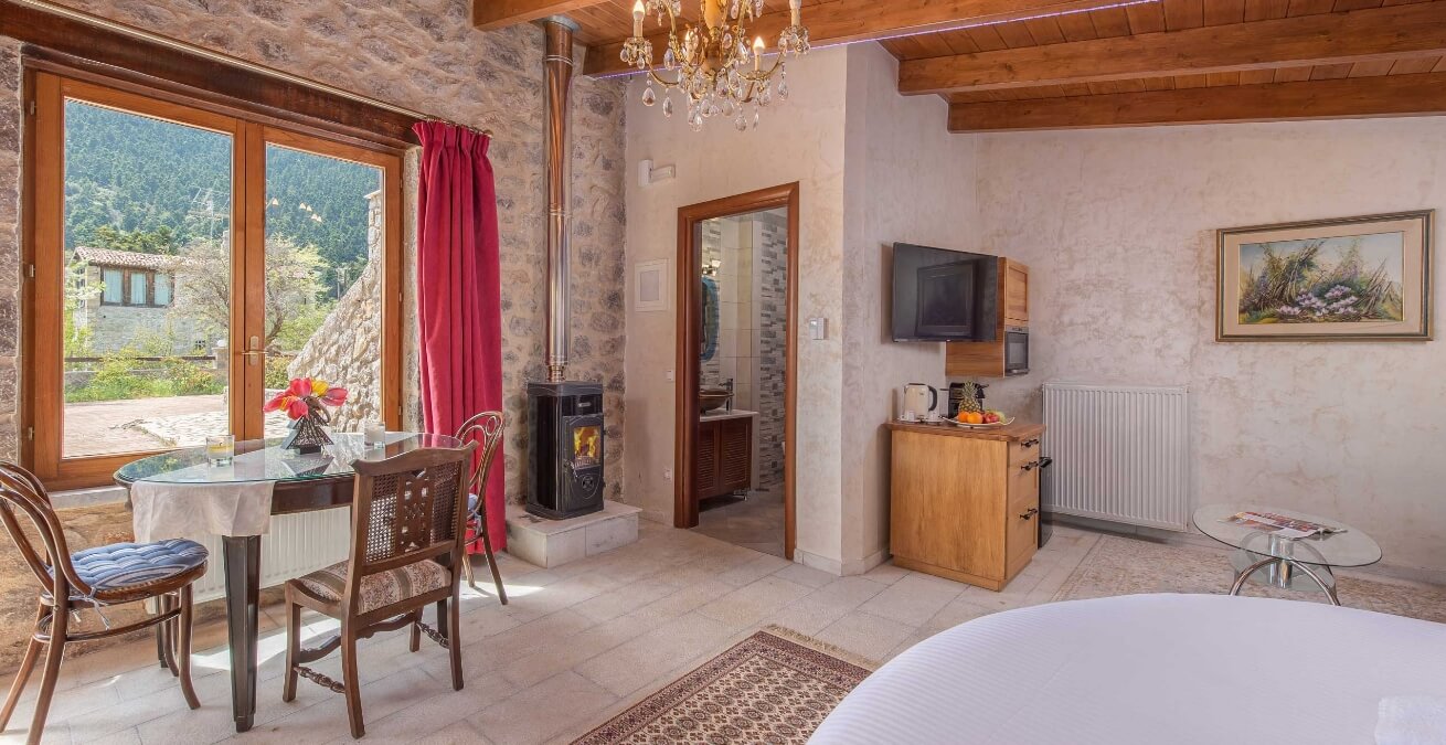 Άνετο καθιστικό με τζακόσομπα και εξοπλισμό ψυχαγωγίας COSMOTE TV
