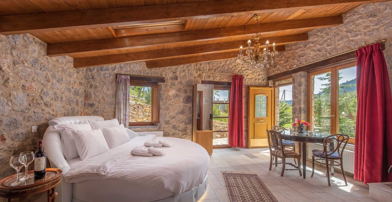 Μία κρεβατοκάμαρα με υπέρδιπλο στρογγυλό κρεβάτι...