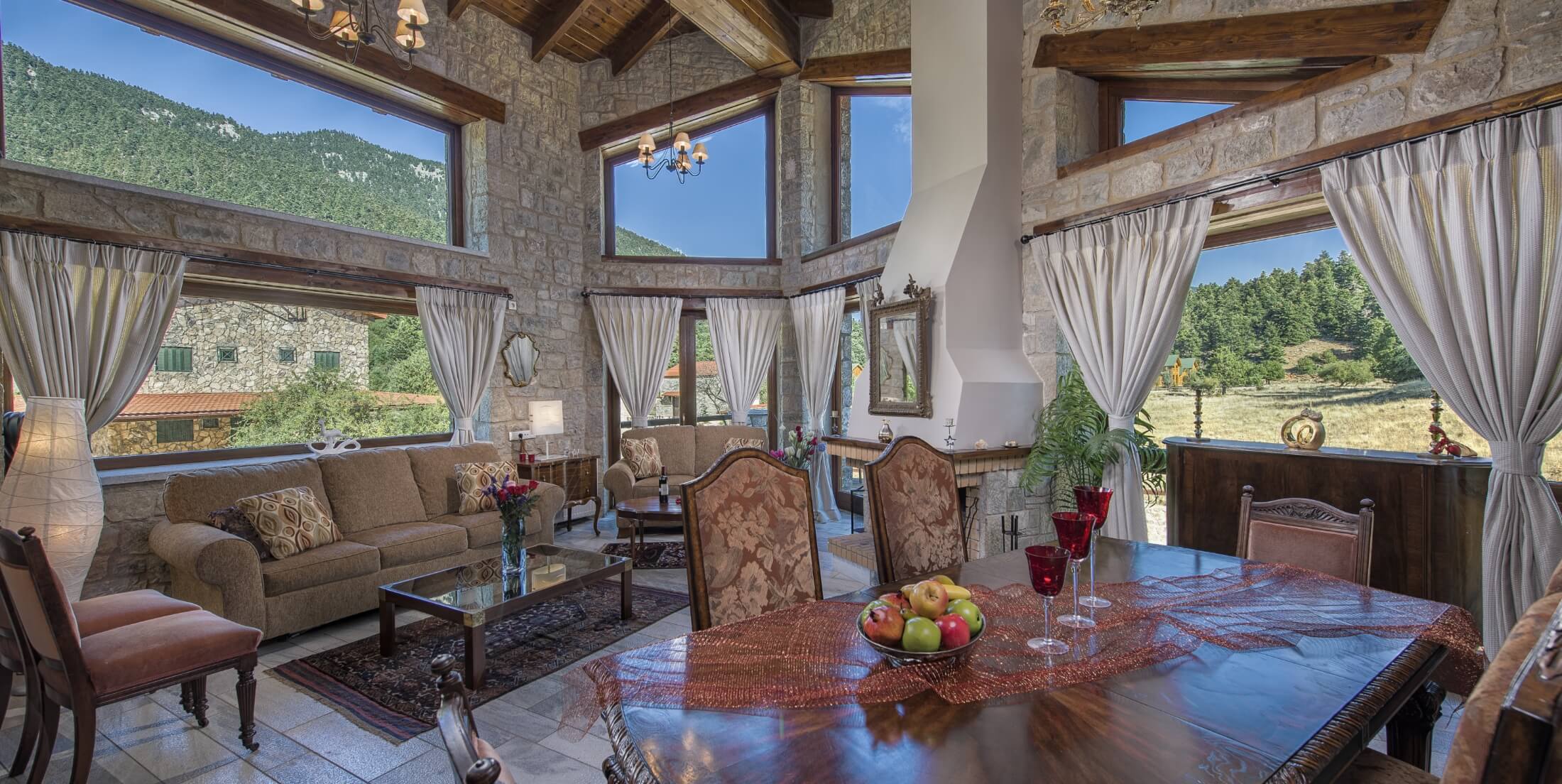 Άνετο καθιστικό με τζάκι, με ξύλινη κεκλιμένη οροφή ύψους 4,5 μέτρων και εξοπλισμό ψυχαγωγίας COSMOTE TV